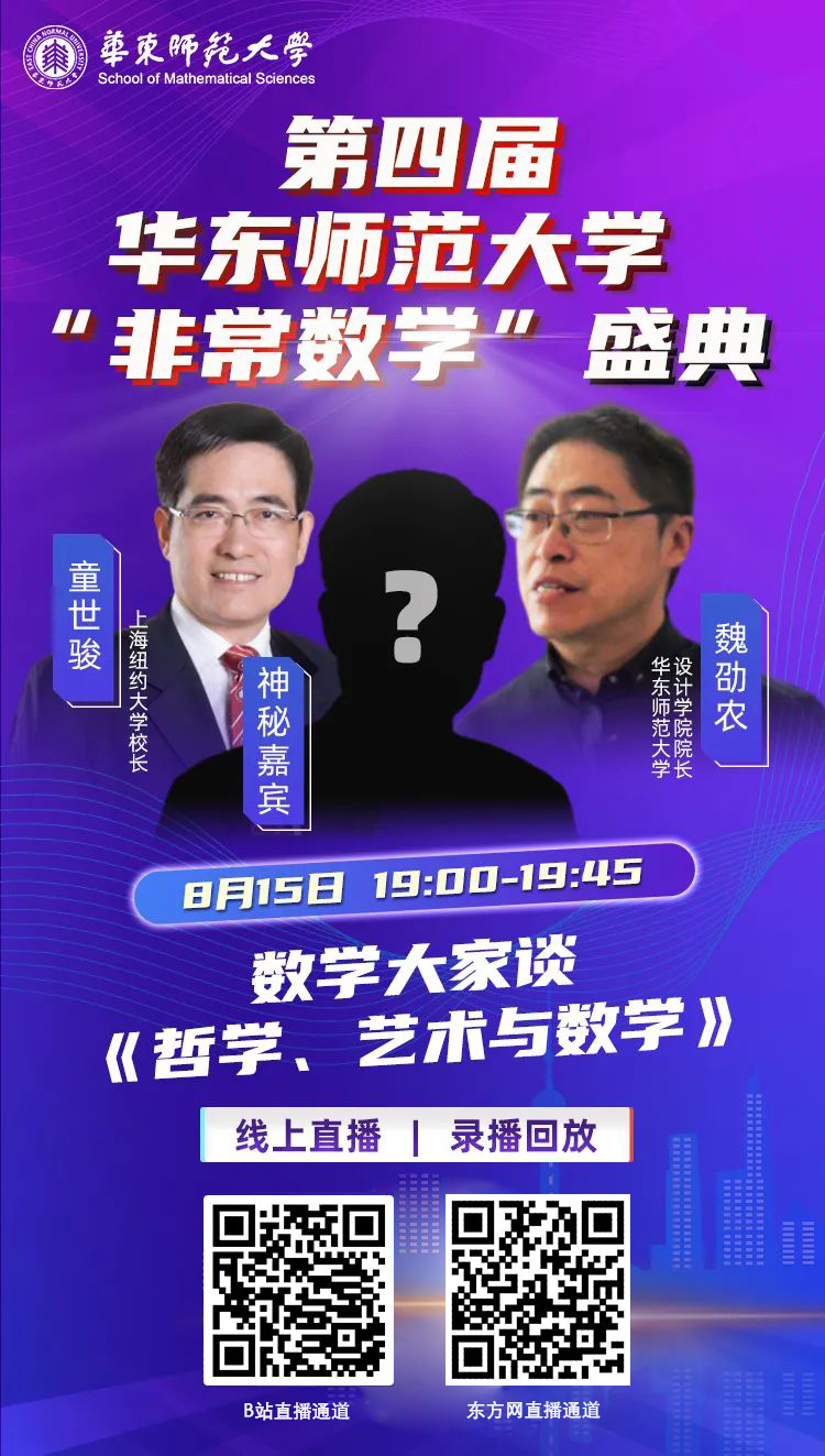 2020年8月15日晚19:00,2020华东师范大学“非常数学“盛典数学大家谈《哲学、艺术与数学》对话论坛在B站、东方网同步直播!