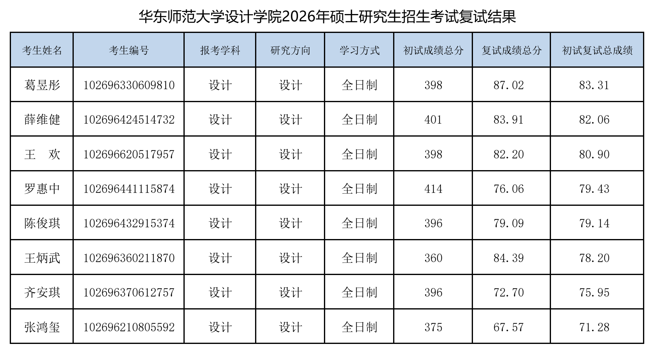 华东师范大学设计学院2026年硕士研究生招生考试复试结果